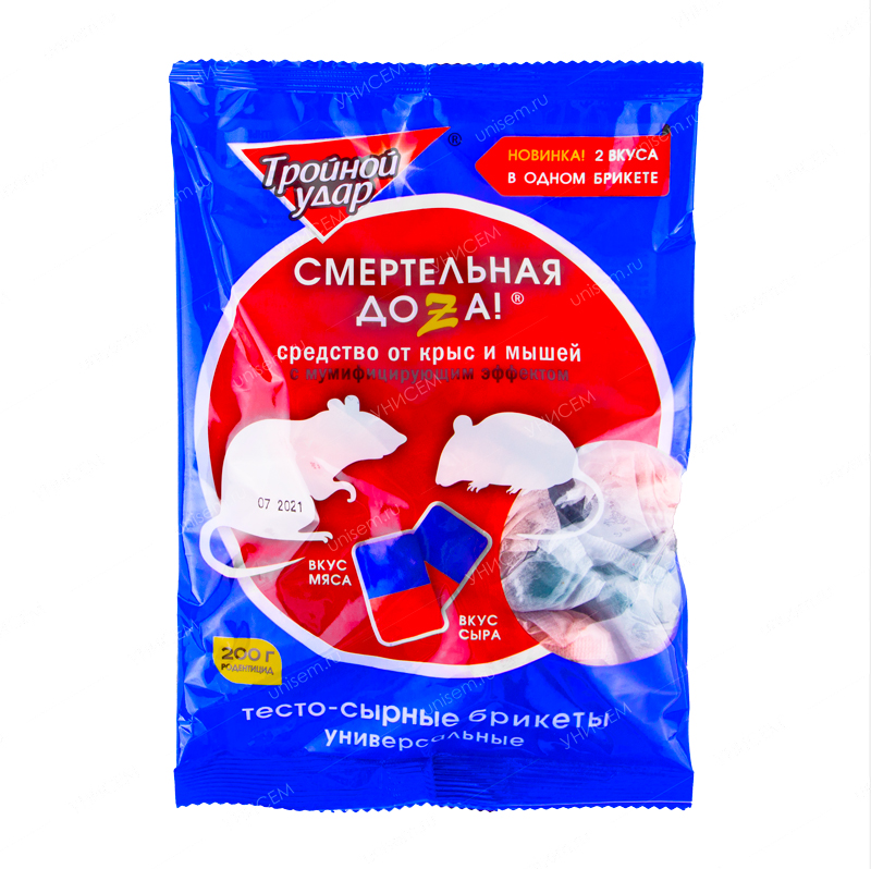 Тройной Удар Смертельная доза от грызунов – родентицидное средство, готовая к применению приманка в виде мягких брикетов красного или синего цвета для уничтожения крыс (серых, черных, водяных) и мышей. Применяется в жилых и нежилых, сухих и влажных помещениях, в подвалах, погребах. В составе приманки два привлекателя: вкус сыра – для мышей, вкус копченого мяса – для крыс. В качестве действующего вещества используется – бромадиолон. Бромадиолон – это родентицид, из класса антикоагулянтов, имеет отсроченный срок действия. Вещество, попадая в организм грызуна, замедляет синтез протромбина в печени. Это приводит к снижению свертываемости крови и истончению стенок кровеносных сосудов. Гибель грызунов наступает на 4-12 день с момента поедания приманки. Состав: бромадиолон (0,005%), битрекс, краситель, пищевые наполнители.